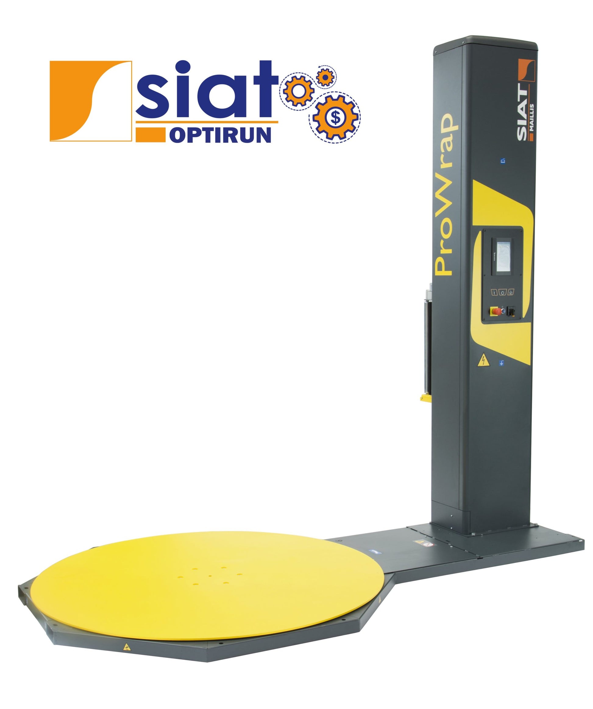 The SIAT ProWrap is a versatile and scalable turntable semi-automatic machine for intensive and demanding stretch film applications, able to optimize film consumption and to guarantee full control of all wrapping parameters throughout the cycle.